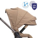 La capota XL y extensible tiene tratamientos UV50+ e impermeable. También cuenta con una ventana de malla para mantener el contacto visual con el niño en todo momento.