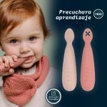 Este set incluye 2 cucharas con una punta plana texturizada que permite que los grumos se adhieran a la cuchara, evitando que se caigan al llevarlos a la boca. Esta característica ayuda a mejorar la experiencia del bebé durante las primeras comidas. Con un mango antideslizante y forma simétrica, las cucharas son fáciles de sostener por el bebé, permitiéndole utilizarlas con ambas manos, lo que fomenta su destreza y coordinación motora.