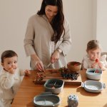 Dentro de la fiambrera encontrará un tenedor y una cuchara ¡Introduce a tu bebé en la comida sólida con el juego de tenedor y cuchara de plástico de Mushie!