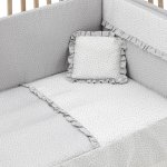 La colcha, es la prenda que viste la cuna y cumple el cometido de protección contra el frío como si de una manta o una funda nórdica se tratara. Su cualidad de tener un relleno desenfundable la convierte en una prenda versátil para ser utilizada en invierno y en verano y también ofrece la ventaja de ser lavada con facilidad. Dispone de tres volantes para remeter la colcha y quede la cuna bién vestida. El protector, fabricado con tejido cuyo interior está acolchado con fibra hueca para amortiguar los posibles golpes del bebé contra la cuna, los cuales se producen por los simples movimientos del bebé cuando está dentro de la cuna. Unas sábanas que envolverán al bebé ara aportarle la maxima suavidad y un par de cojines decorativos que le darán el toque a la colección.