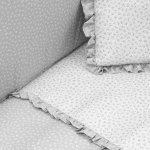 La colcha, es la prenda que viste la cuna y cumple el cometido de protección contra el frío como si de una manta o una funda nórdica se tratara. Su cualidad de tener un relleno desenfundable la convierte en una prenda versátil para ser utilizada en invierno y en verano y también ofrece la ventaja de ser lavada con facilidad. Dispone de tres volantes para remeter la colcha y quede la cuna bién vestida. El protector, fabricado con tejido cuyo interior está acolchado con fibra hueca para amortiguar los posibles golpes del bebé contra la cuna, los cuales se producen por los simples movimientos del bebé cuando está dentro de la cuna. Unas sábanas que envolverán al bebé ara aportarle la maxima suavidad y un par de cojines decorativos que le darán el toque a la colección.